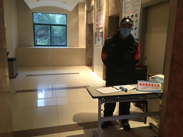 圖為來(lái)院探視人員設(shè)置的登記處,重點(diǎn)登記體溫及有無(wú)武漢接觸史、近期有無(wú)感冒發(fā)熱等癥狀。