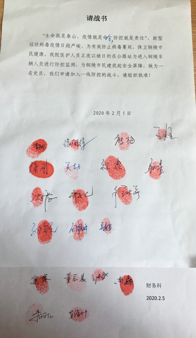 在得知橋南社區(qū)工作者們夜以繼日地在山水之門卡點為人員進行預(yù)檢防控工作時,市三院一支部的黨員們紛紛遞交戰(zhàn)書,主動請纓加入山水之門預(yù)檢防控工作的隊伍,“為有效防止病毒蔓延,保衛(wèi)銅陵市人民健康,作為一名黨員,我們申請加入一線防控的戰(zhàn)斗”,請戰(zhàn)書上字字鏗鏘,十幾顆鮮紅的手印透著別樣的堅強與勇敢。