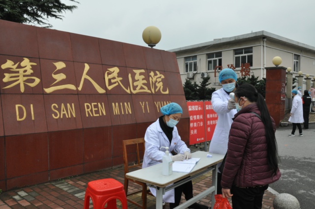 醫(yī)院只保留大門(mén)唯一進(jìn)出通道,設(shè)置安全檢查崗,入院前監(jiān)測(cè)體溫,做健康登記,發(fā)熱者一律不得入院,關(guān)閉探視和外賣(mài)通道,如有特殊送餐需求的相關(guān)科室人員來(lái)門(mén)崗領(lǐng)取。為防止人員聚集,醫(yī)院設(shè)立“臨時(shí)候診區(qū)”,并由醫(yī)護(hù)人員引導(dǎo)分診,門(mén)診實(shí)行“一醫(yī)一患一診室”制度,有效避免院內(nèi)交叉感染。