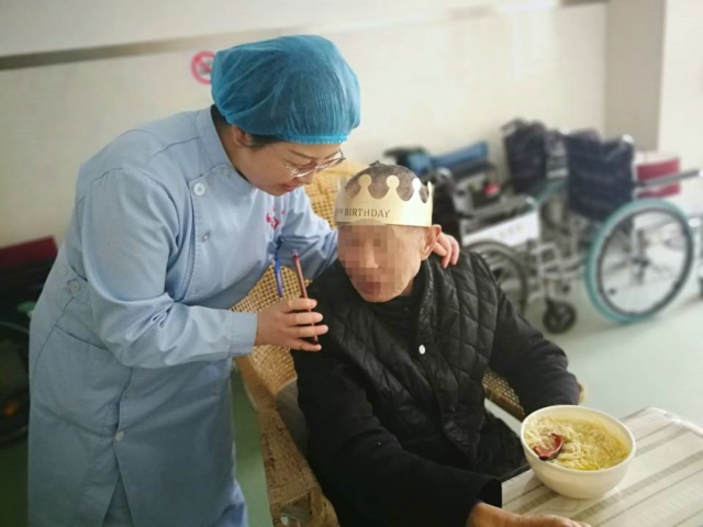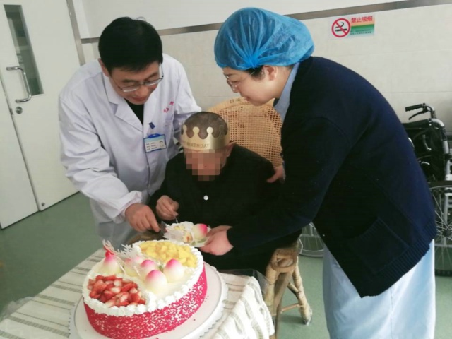 隨著“祝你生日快樂”的歌聲響起,醫(yī)護(hù)人員擺放好蛋糕,點上蠟燭,85歲的患者付祥生老人急忙拿起十一病區(qū)傅海靜護(hù)士長與其兒子連線的視頻電話,“我今天特別高興,雖然疫情特殊時期,你們不能進(jìn)來陪我,三院的醫(yī)生護(hù)士還記得給我過生日呢?!备断樯先藷釡I盈眶,急忙告訴家里人這個好消息。付祥生老人是2018年12月因“突發(fā)沖動,近記憶力進(jìn)行性減退5年”,家人無法管理,來到十一病區(qū)住院至今。經(jīng)過一年多的康復(fù)治療,患者的病情有了較大的好轉(zhuǎn),性情變得溫和多了,“您父親的病情恢復(fù)得挺好,我們代表銅陵市第三人民醫(yī)院十一病區(qū)跟您父親過個生日,也準(zhǔn)備有蛋糕、長壽面、還為他做了他愛吃的菜肴,在這里我們就是她的家人,雖然新冠疫情特殊時期你們不能來病房探視,有我們在,你們請放心!”十一病區(qū)王新紅主任在與老人的兒子電話連線時說到。電話里,老人激動地與老伴說:“感謝主任、感謝護(hù)士長和醫(yī)生、護(hù)士們陪我過生日,讓我感受到家的溫暖,我一點不孤單”,老人還和兒子、孫子分享了生日快樂。為了給老人過一個難忘的85歲生日,生日當(dāng)天十一病區(qū)護(hù)士長買來了生日蛋糕,伴著生日歌醫(yī)護(hù)人員圍繞在“壽星”身邊,對著蛋糕默默許愿,愿他生日快樂,健康長壽!
