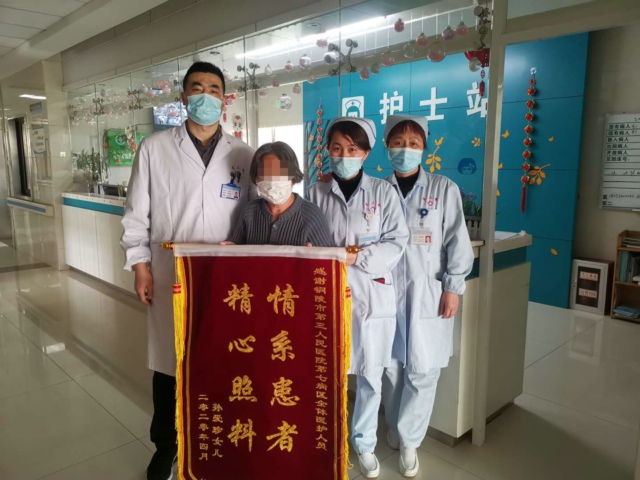 “這段時間真是太辛苦你們了,太感謝你們了,老太太這段時間過好了,臉上都有肉了?!辈⒁幻嬗∮小扒橄祷颊?,精心照料”的錦旗送到科主任的手里,感謝疫情期間科室醫(yī)護(hù)人員給予的細(xì)心照顧和暖心關(guān)懷。
