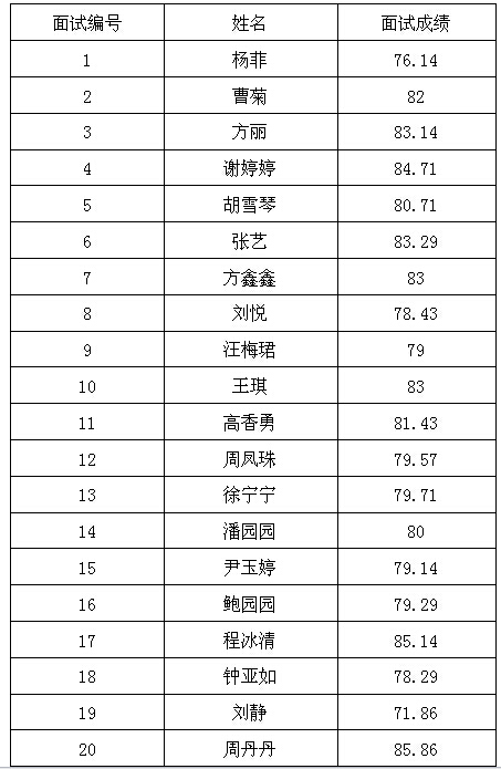 銅陵市第三人民醫(yī)院2015年公開招聘護(hù)理人員面試成績公布如下: