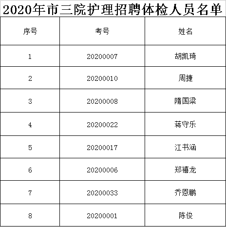根據(jù)《銅陵市第三人民醫(yī)院2020年公開招聘工作人員公告》規(guī)定,現(xiàn)將護理招聘進入體檢人員名單公布如下: