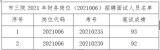 根據(jù)《銅陵市第三人民醫(yī)院2021年公開招聘工作人員公告》,市三院2021年財(cái)務(wù)崗位(2021006)招聘考試面試入圍人員共2人名單如下,請面試人員于3月21日上午8:00前到市三院綜合樓三樓抽簽面試。