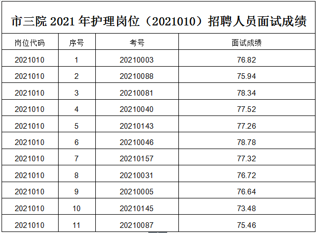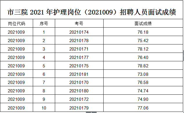 市三院2021年護(hù)理崗位(2021010)招聘人員面試成績(jī)?nèi)缦拢?/p>